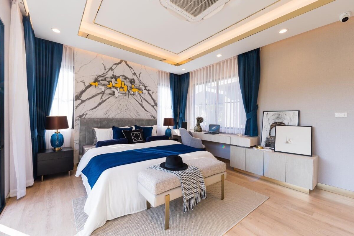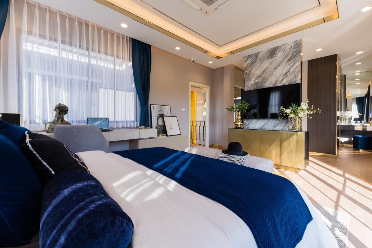 This 4-bedroom pool villa for sale in Koh Kaew, Phuket is located literally right next door to the British International School Phuket (BISP), offering a rare combination of architectural character and everyday convenience. This residence is a show unit, showcasing custom interior design and high-quality finishes. Large windows allow natural light to flow into the living spaces, while uninterrupted mountain and green views can be enjoyed from both the main living area and the master bedroom.