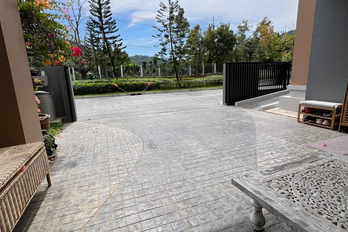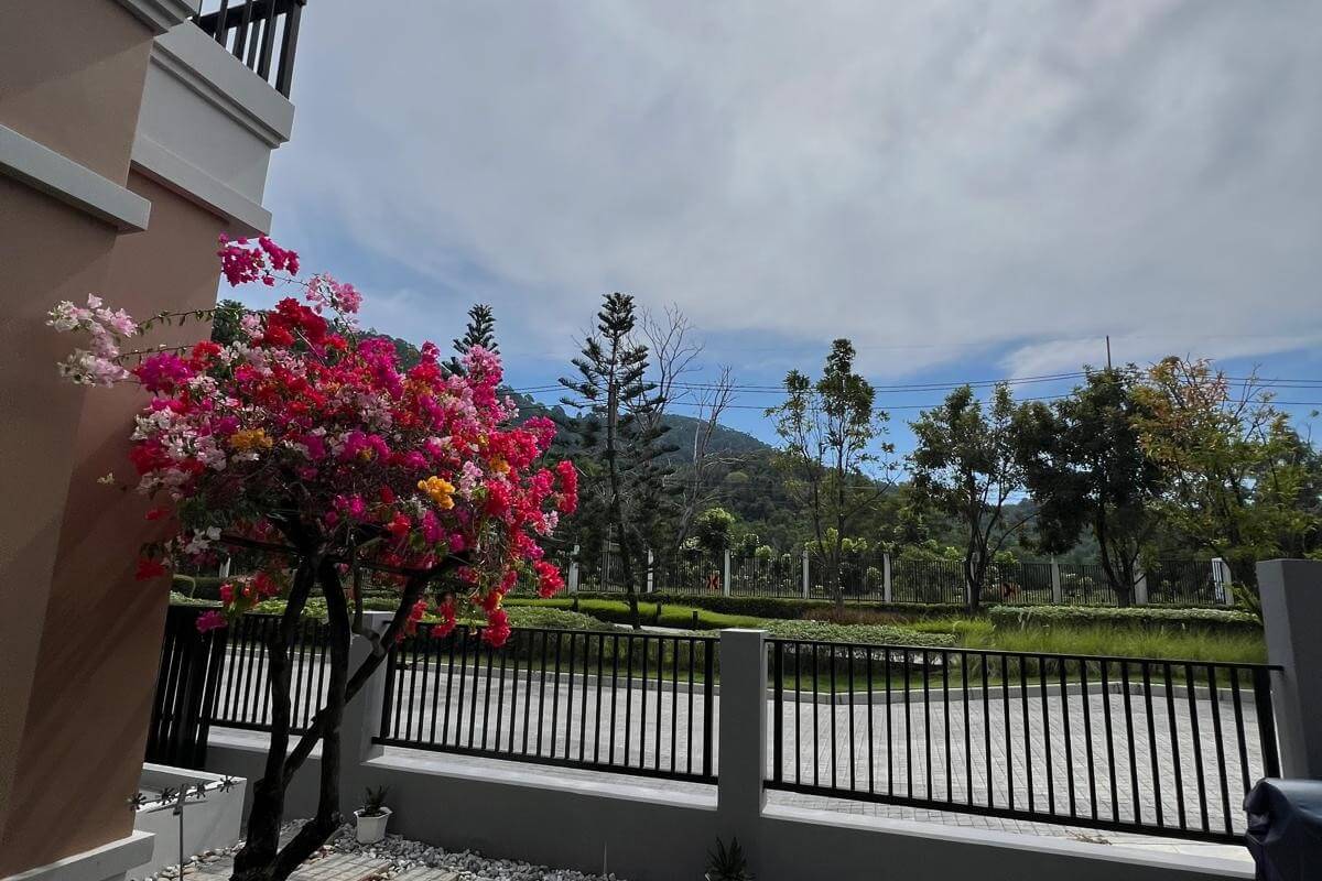 The villa sits on a 260 sqm land plot and includes private parking for 2 cars. Low wrought-iron grille fencing frames the property, creating a defined yet open boundary that complements the villa’s overall character. From the outdoor areas, the villa enjoys open views toward the surrounding mountains and established greenery.