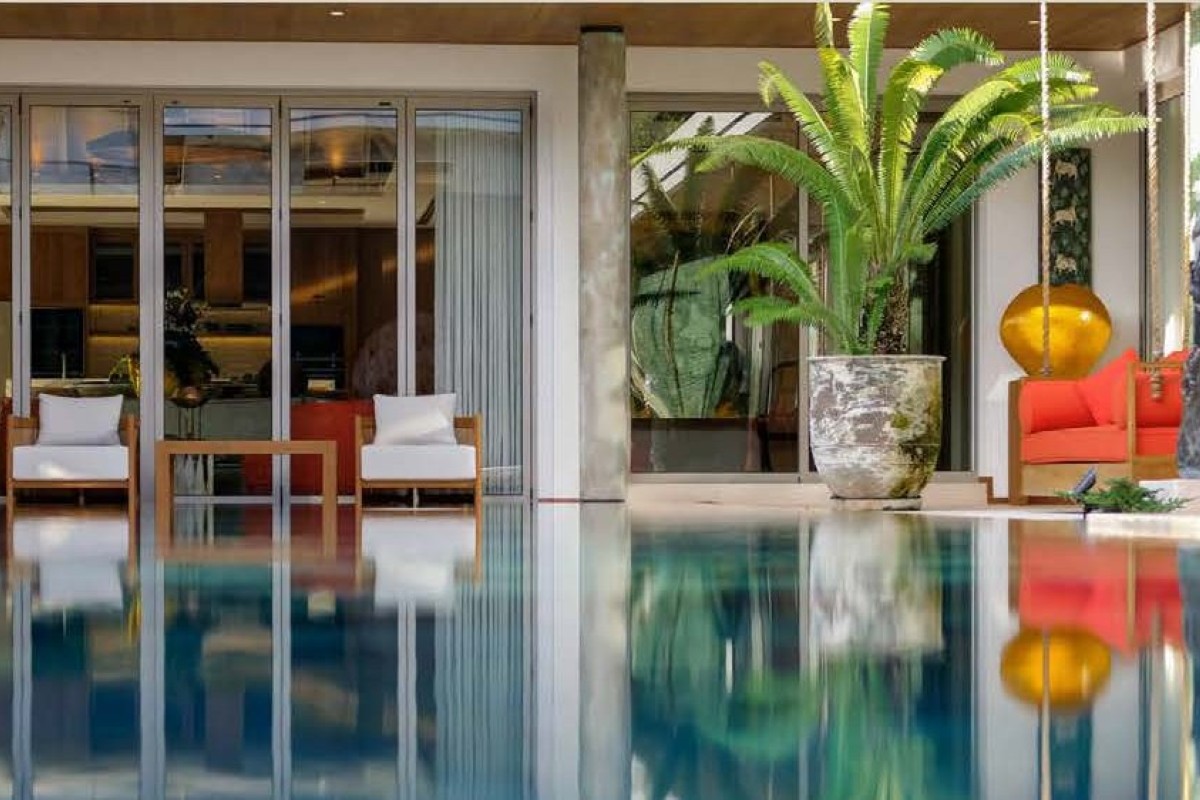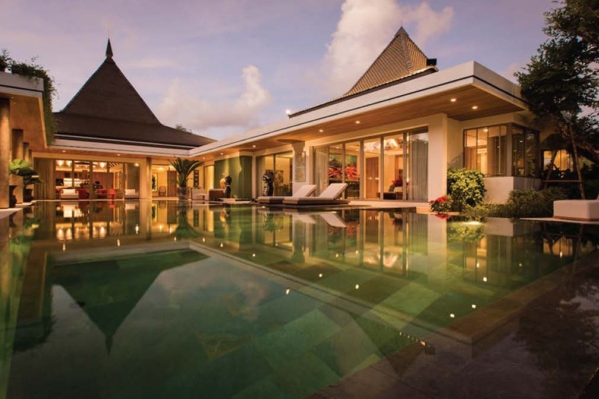 Modern-tropical, Asian-fusion villas with bespoke interiors, natural materials, high-pitched roofs, and seamless indoor–outdoor living spaces centred around large private swimming pools.