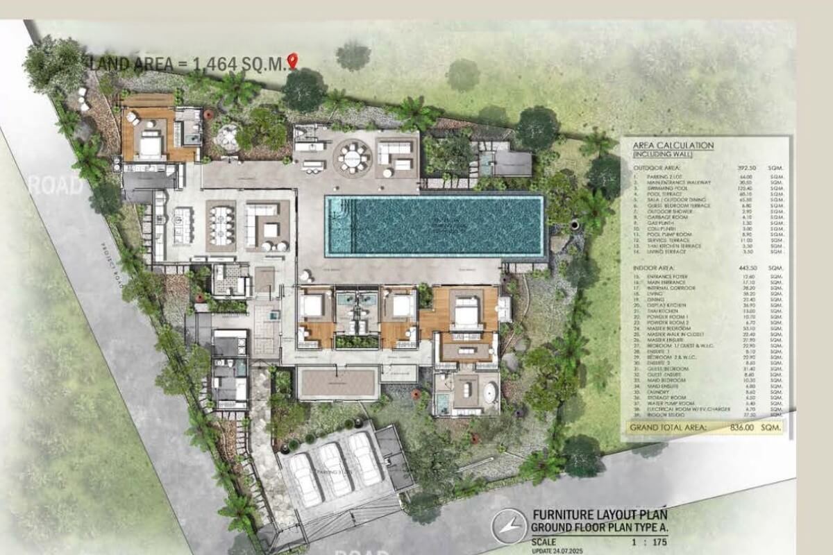 The development features 39 single-storey pool villas with 4–5 bedrooms and 5–6 bathrooms, offering built-up areas ranging from 487–1,646 sqm. The villas sit on unusually large land plots of 1,092–3,200 sqm, providing exceptional space and privacy compared to most villa developments in Phuket.