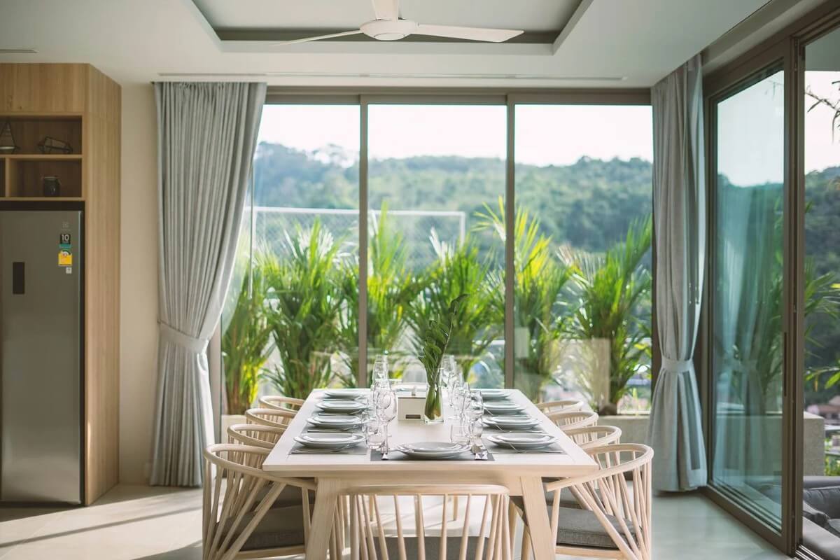 Set at the end of a quiet hillside road, with the mountains of Kamala as a scenic backdrop, featuring expansive glass walls and windows framing the surrounding landscape.