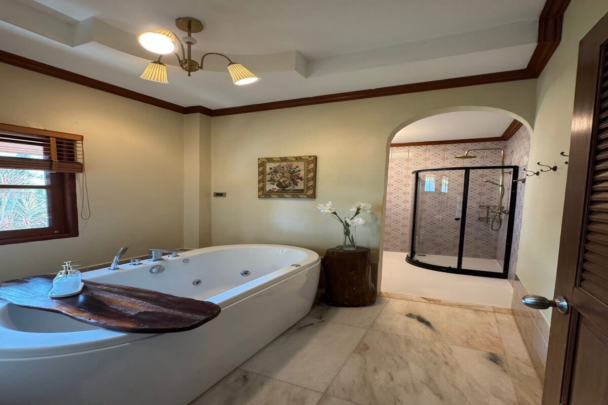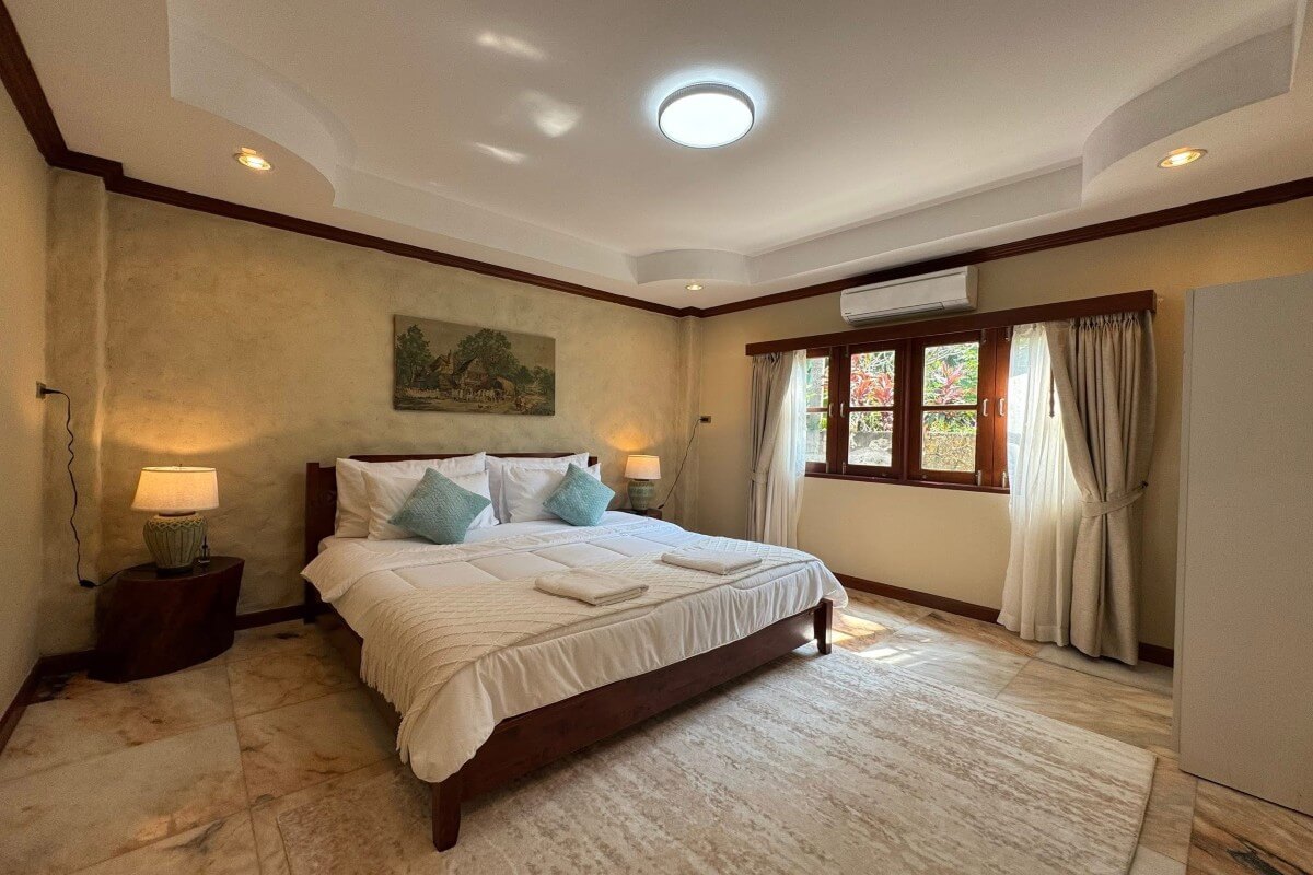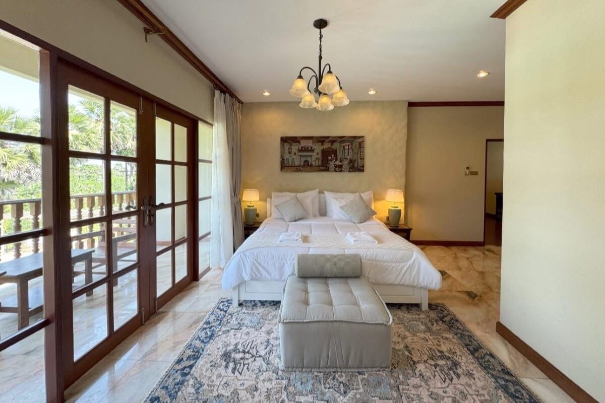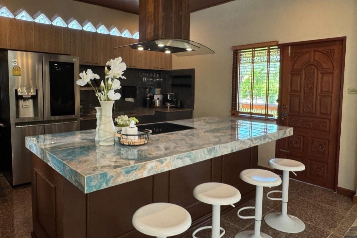 This 5-bedroom pool villa for sale in Chalong, Phuket sits on a 2,028 sqm plot, where natural textures and earth-toned colours give the home a modernised mountain retreat feel. The interiors combine stylish elements with practical layouts designed for comfortable everyday living. The property also benefits from clean natural groundwater (fresh and safe) and a centralized hot water system.