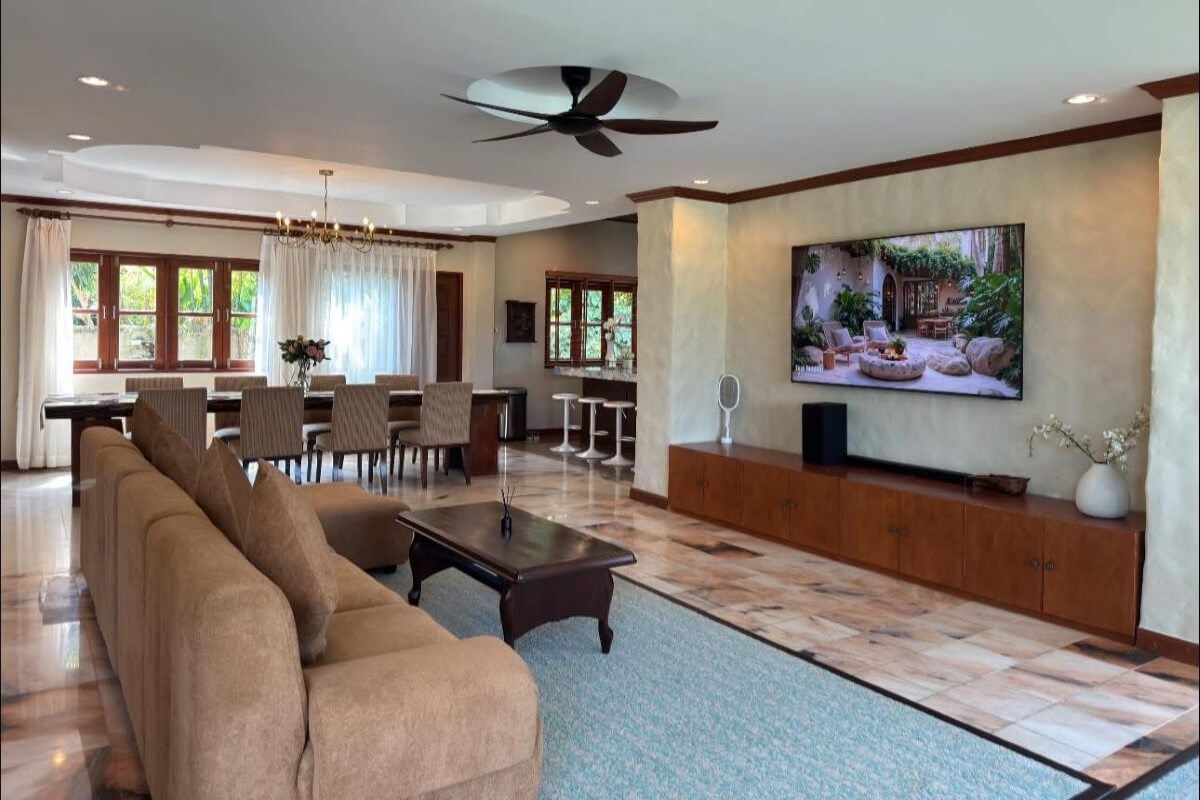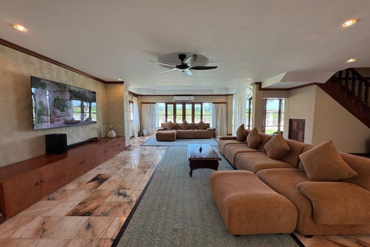 The property has a built-up area of 520 sqm over 2 levels. The villa opens to a foyer leading into a spacious living room with two seating areas. The dining area connects to a fully equipped kitchen, complete with dishwasher, hot and cold water, and a breakfast island.