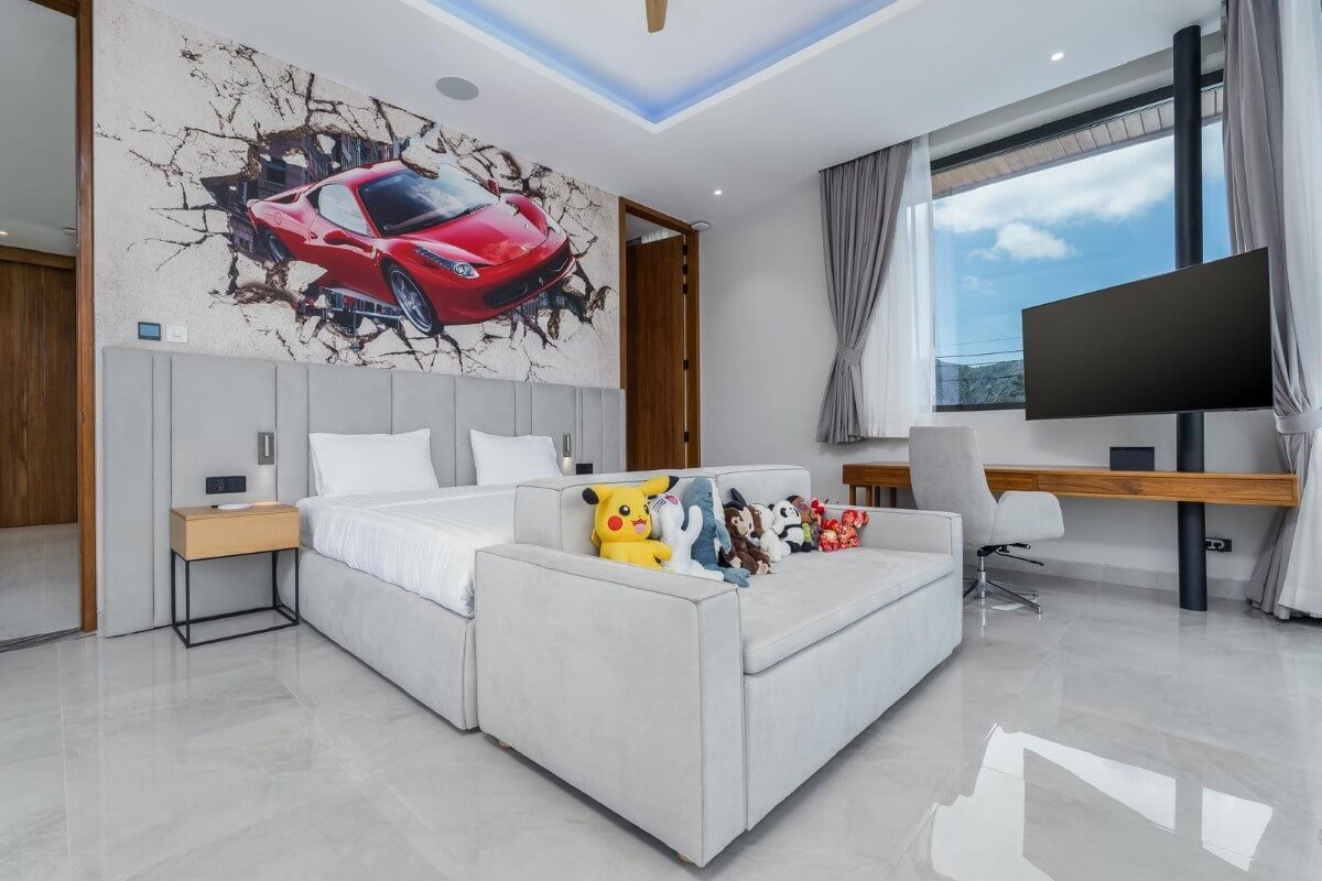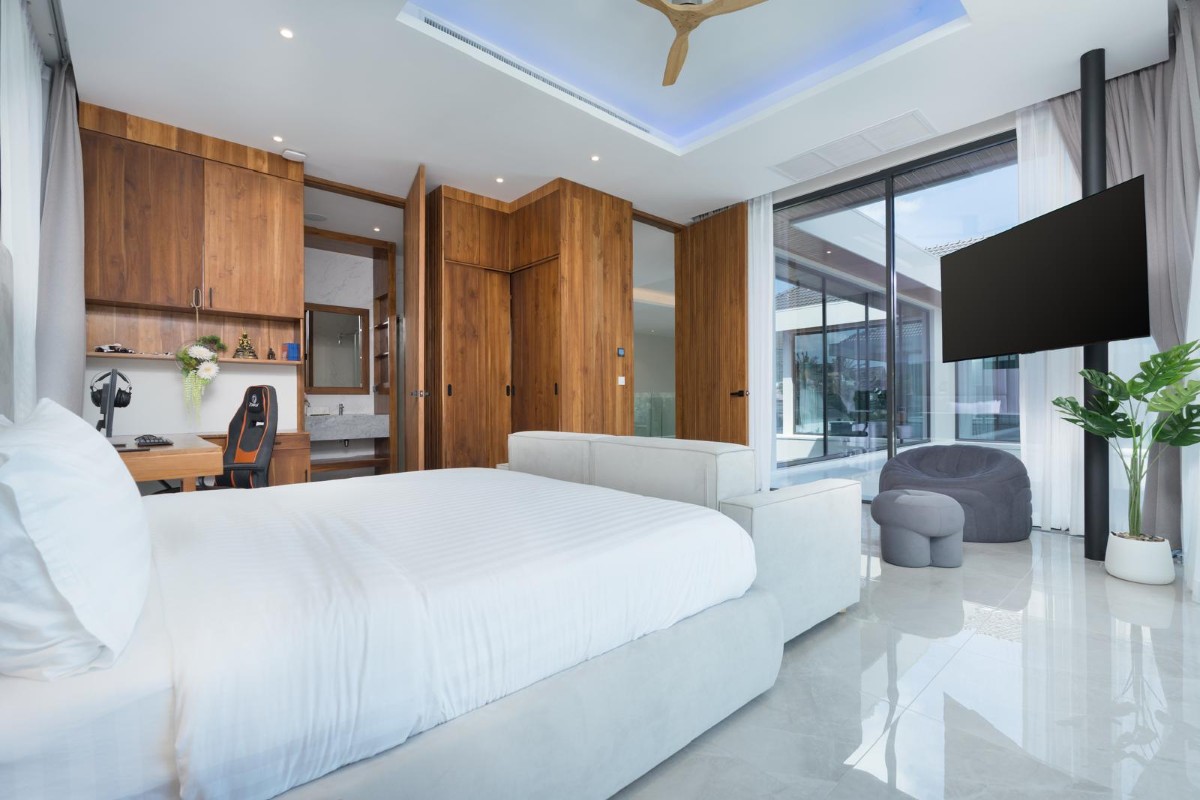This 5-bedroom pool villa for sale near Nai Harn Beach in Rawai, Phuket features a large 56 sqm pool with jacuzzi and a fully integrated smart home system. Lighting, air conditioning, curtains, security, and pool systems are seamlessly automated and controlled remotely via smartphone.The master bedroom is fully light-isolated for complete comfort and rest. Solar panels and European-standard insulation deliver exceptional energy efficiency. A property of this size would typically incur electricity costs of around 20,000 THB per month, yet the current owner averages approximately 3,000 THB monthly.