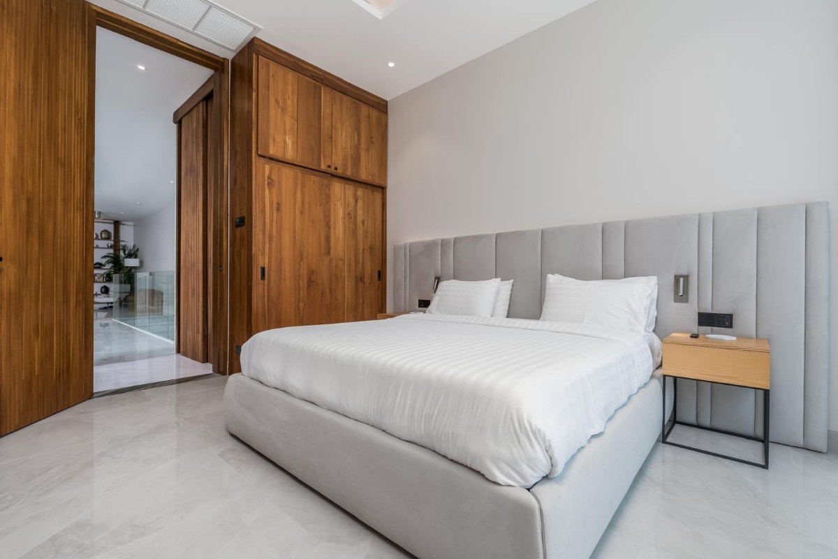 Set on a generous fully fenced 950 sqm plot, the villa offers expansive outdoor space. The 56 sqm private pool features a jacuzzi and mosaic finish. It is powered by the latest hybrid system and fully self-regulated through smart domotics technology, allowing remote control of filtration, chemical levels, heating, and lighting via smartphone.
