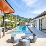 The villa sits on a 600 sqm plot with a landscaped tropical garden and generous outdoor spaces. A Thai sala provides covered seating beside the pool, while sun loungers and outdoor furniture are arranged along the terrace. The pool bar includes a counter for food preparation and serving. The 12-metre pool has a built-in jacuzzi and a shallow zone for children.