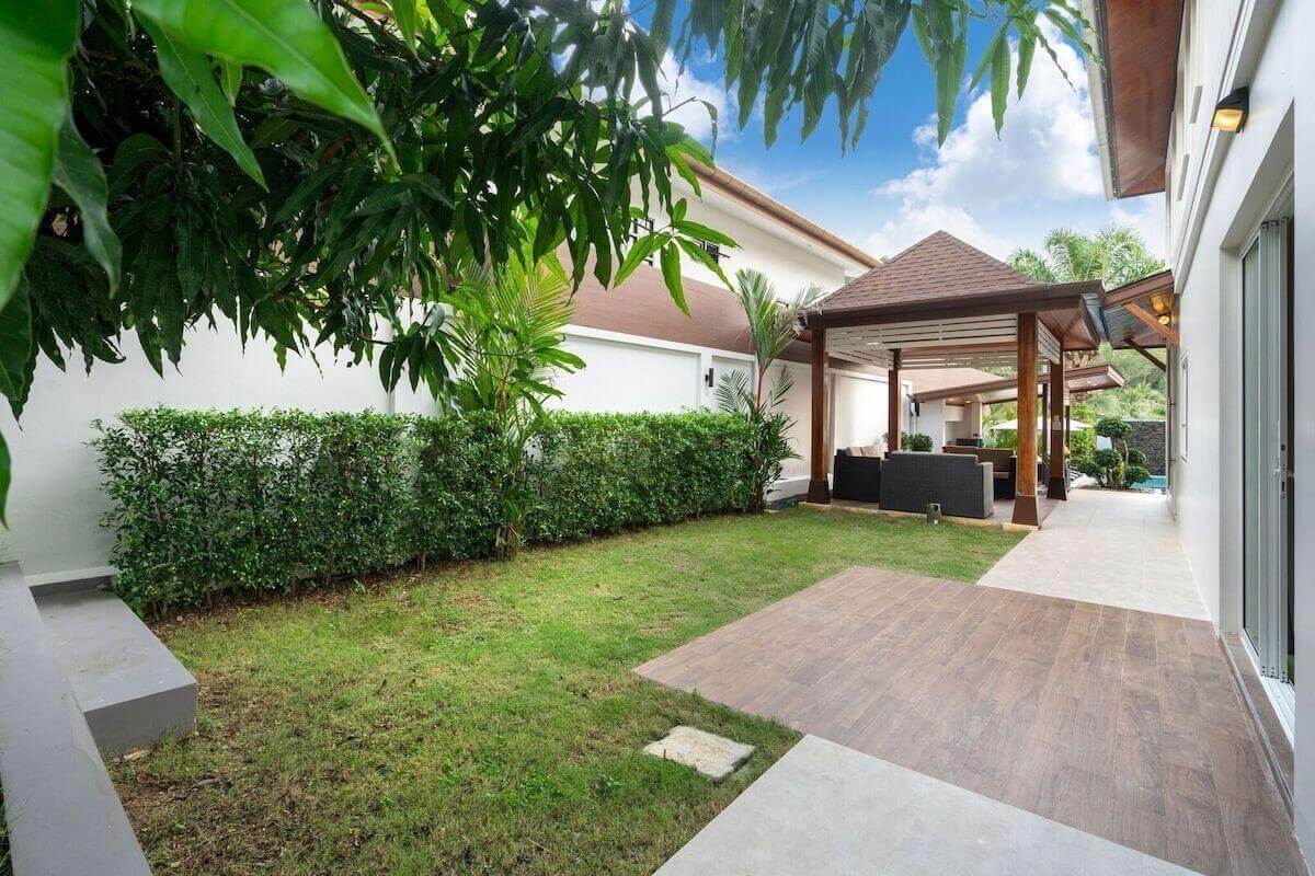 The villa sits on a 600 sqm plot with a landscaped tropical garden and generous outdoor spaces. A Thai sala provides covered seating beside the pool, while sun loungers and outdoor furniture are arranged along the terrace. The pool bar includes a counter for food preparation and serving. The 12-metre pool has a built-in jacuzzi and a shallow zone for children.