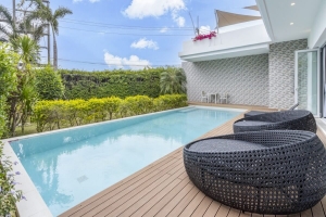 This 4-bedroom pool villa with basement and roof terrace for sale in Cherng Talay, Phuket combines modern style with flexible living spaces for an ideal family home. Providing quite a rare set-up, this home blends elegance, comfort, and practicality in one standout property.